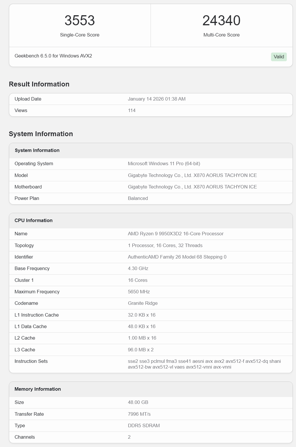 Novo pojavljivanje u Geekbench bazi podataka ponovo je pokrenulo rasprave o AMD-ovom još neobjavljenom procesoru Ryzen 9 9950X3D2. Iako se ovaj model već ranije pominjao kroz različite procurele informacije, ovo je jedan od jasnijih pokazatelja njegovih performansi do sada. Prema Geekbench v6.5 testu, procesor ostvaruje 3.553 poena u single-core testu i 24.340 poena u multi-core testu.