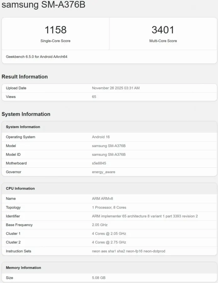 Što se tiče performansi, Galaxy A37 je ostvario 1.158 bodova u single-core i 3.401 bod u multi-core Geekbench testovima. Ovi rani rezultati već ga stavljaju ispred Galaxyja A36, koji koristi Snapdragon 6 Gen 3 i u našem testu je postigao 1.007 single-core i 2.917 multi-core bodova. Konačne, maloprodajne verzije A37 vjerovatno će pružiti još bolje rezultate nakon optimizacije.