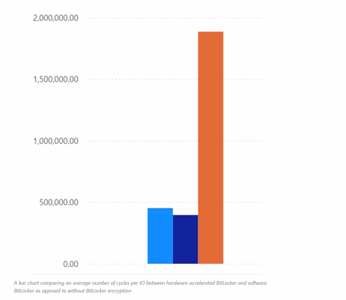 U ranijim verzijama, BitLocker se uglavnom oslanjao na softversku AES-XTS enkripciju, što je znatno povećavalo CPU opterećenje. Prosječan broj ciklusa po I/O operaciji na sistemima bez enkripcije iznosio je oko 400.000, dok je sa uključenim BitLockerom taj broj rastao i do 1,9 miliona. To je dovodilo do primjetnih usporenja, naročito tokom multitaskinga i pri nasumičnom pristupu disku.