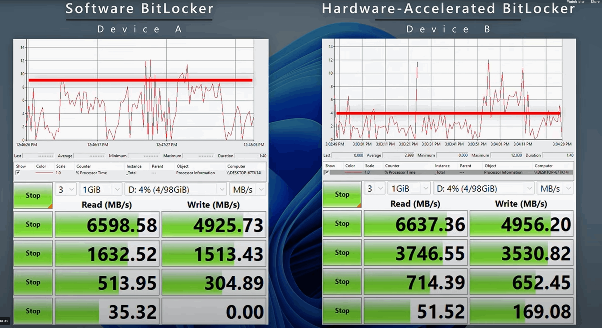 Ovi dobici su posebno važni za savremeno korišćenje Windowsa, gdje mali i nasumični I/O zadaci dominiraju svakodnevnim aktivnostima poput pokretanja aplikacija, rada pozadinskih servisa i multitaskinga. U staroj, isključivo softverskoj verziji BitLockera, upravo su ove operacije trpjele najveći pad performansi.